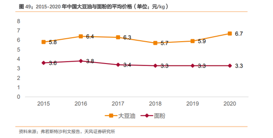 因为大豆油和面粉都是关系国计民生的大宗商品,一定程度上受到政府管控,卫龙的原材料采购价格近5年较为稳定,2018-2020年原材料成本占营收的比例分别为31.3%、29.8%及27.8%。