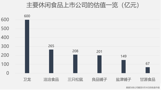 有趣的是,几块钱一包的辣条,给卫龙带来的估值竟然达到600亿元,接近良品铺子、洽洽食品与三只松鼠三家休闲食品公司的市值之和。