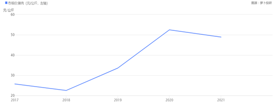 其他公司的原材料可没这么省心。猪肉的价格近些年可谓是上天入地,2018年最低不到23元/公斤,去年就涨到52元/公斤。
