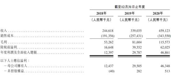 据港交所披露的招股书显示,2018年至2020年,祥生活服务的收入分別为2.446亿元、3.39亿元及4.591亿元,复合年增长率为37%;毛利分别为0.533亿元、0.816亿元及1.156亿元,复合年增长率达到47.3%。净利润从2018年的0.124亿元增长至2020年的0.469亿元,复合增长率达94.4%。