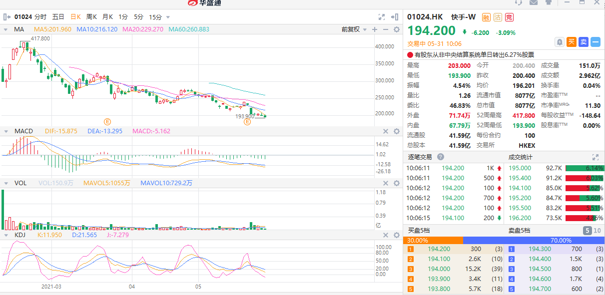 华盛资讯5月31日消息,快手今日盘中持续走低,最低见193.9港元刷新历史新低。截至发稿,快手跌3.09%,报194.2港元每股,最新总市值8077亿港元,较发行价仅剩70%的升幅。