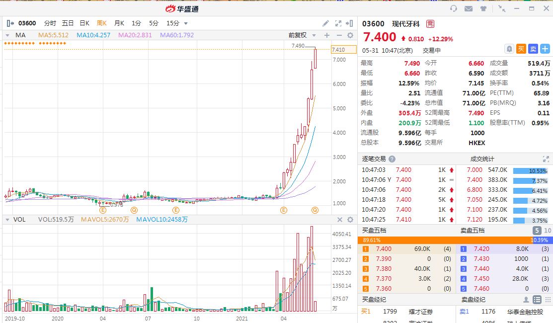 华盛资讯5月31日消息,现代牙科今日持续强势,截至发稿,现代牙科上涨12.29%,现报每股7.4港元,总市值71亿港元,成交额3711万港元。股价高见7.49港元,刷新历史新高。