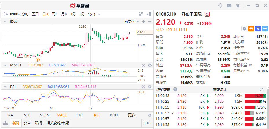 华盛资讯5月31日消息,好孩子国际盘中拉升涨超10%。截至发稿,好孩子国际涨10.99%,报2.120港元每股,最新总市值35.36亿港元,该股此前创阶段新高后持续回调,绩后股价开始反弹,截至目前累计涨幅超20%。