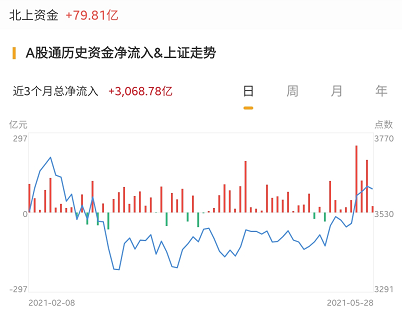 北上资金今日净流入79.81亿元,上周五为净流入超22亿元。