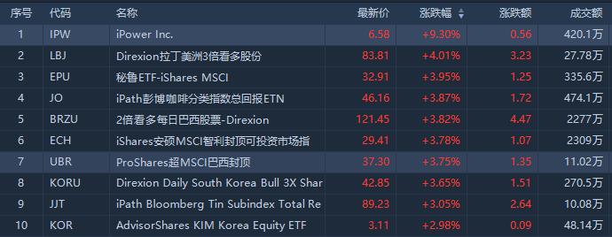 涨幅居前的ETF主要有拉丁美洲3倍看多股票的LBJ涨超4%;2倍看多每日巴西股票的BRZU涨3.82%,成交额2277万美元。
