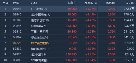 今日涨幅位居前的ETF有F山证铁矿石涨近5%;GX中国电车涨超4%,成交额9367万港元。