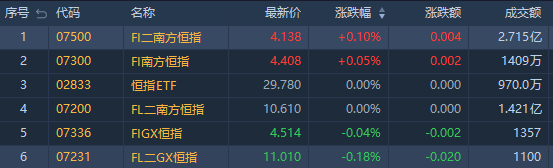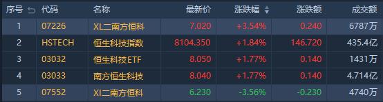 看多恒指相关ETF走强,南方两倍做多恒科(07226.HK)涨3.54%,成交额6787万港元;南方恒生科技(03033.HK)涨1.77%,成交额1431万亿港元;