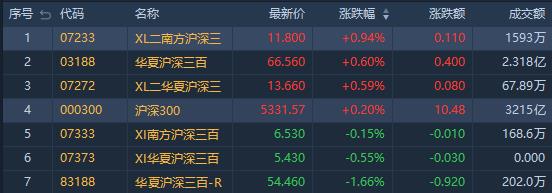 沪深300指数收涨0.2%。其中,华夏沪深三百-R(83188.HK)跌1.66%,成交额202万港元;华夏沪深三百ETF(03188.HK)涨0.6%,成交额2.32亿港元。