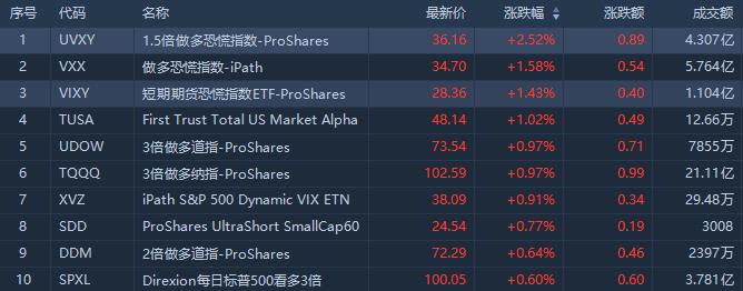 涨幅居前的有,1.5倍做多恐慌指数的UVXY涨2.52%,成交额4.31亿美元;做多恐慌指数的VXX涨1.58%,成交额5.67亿美元。