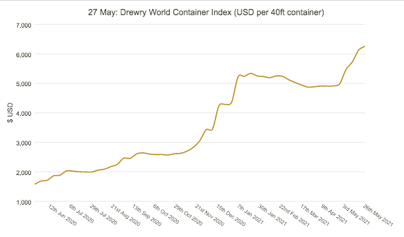 国际物流咨询公司德鲁里发布的世界集装箱指数(Drewry World Container Index)的最新数据显示,目前从上海到鹿特丹的40英尺集装箱运费涨至10174美元,较前一周上涨3.1%,同比上升485%。从全球范围看,世界集装箱运价指数(WCI)上涨至6257美元,同比上涨293%。两项指数均达到2011年有记录以来的最高水平。Drewry称,目前亚洲到欧洲的集装箱货运价格不断推升,贸易商在供应链方面的成本压力将越来越大。