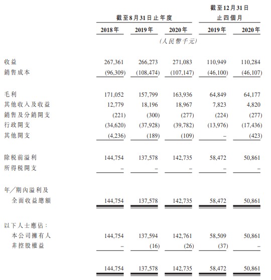 截至2018年、2019年及2020年8月31日止年度以及截至2019年及2020年12月31日止四个月,公司分别产生总收益人民币2.674亿元、人民币2.663亿元、人民币2.711亿元、人民币1.109亿元及人民币1.103亿元。