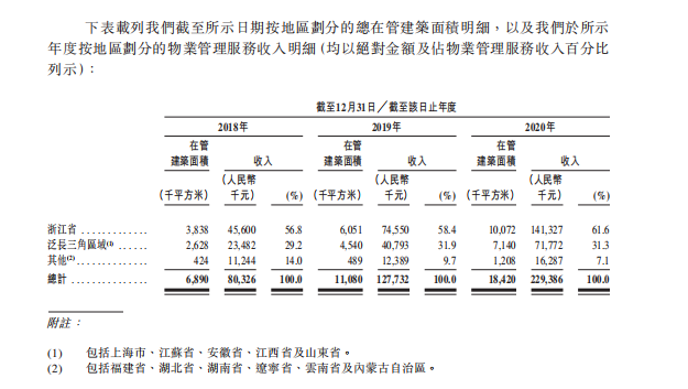 积极推动物业板块上市的背后,近年来,祥生活扩张增速显著。招股书显示,祥生活是一家深耕浙江省及泛长三角区域的综合物业管理服务供应商。公司坚持“1+1+X”的布局策略,立足于浙江省,深耕泛长三角区域。截至2020年底,祥生活在管项目116个,总在管建筑面积1840万平方米,遍布中国9个省26个城市,订约管理项目也达到了210个,总合约建筑面积3730万平方米。其中,浙江省及泛长三角区域在管总建筑面积1720万平方米,占总在管面积的93.4%。