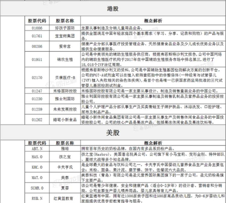 受此消息影响,A股多只概念股尾盘异动拉升,港股母婴概念股大涨,以下为解图君整理的港股、美股市场相关概念股名单: