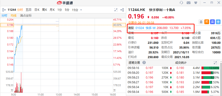 相关涡轮方面,快手摩利一十购A跟涨40%,其行使价为231.08港元,到期日为2021年10月11日,溢价率达20.52%。