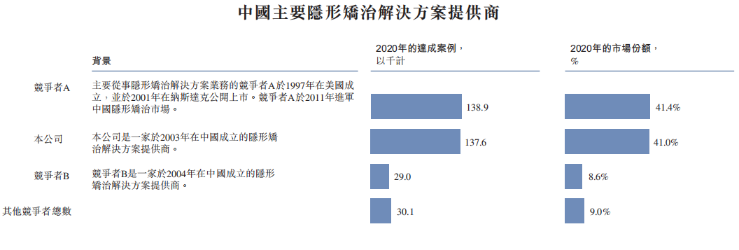 2020年,在高度集中的中国隐形矫治解决方案市场,两大厂商占据市场份额的82.4%,其中时代天使科技的市场份额为41%仅次于美国厂商艾利科技的41.4%。