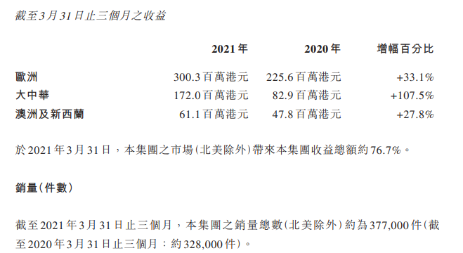 其中来自中国内地收益约9710万港元,同比增加232.5%,较2019年同期增加39.5%。
