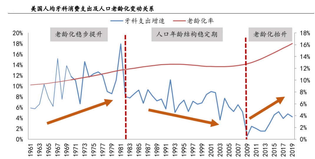 这三个阶段中,美国人均牙科消费的增速也呈现“抬升-降低-抬升”趋势,与老龄化进程呈现较强的相关性。