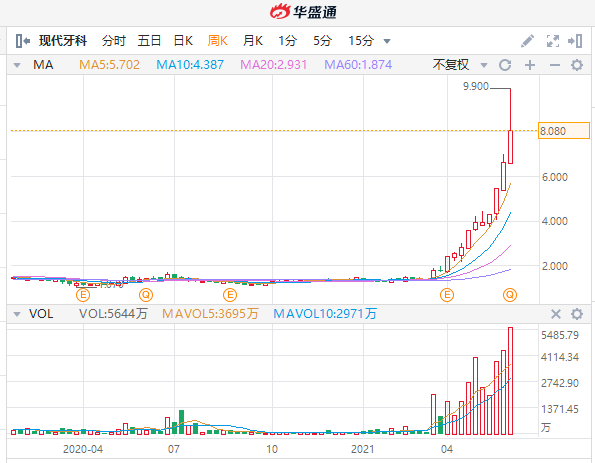 今日早间,现代牙科再度突破历史新高,股价触及9.9港元。不过下午,现代牙科股价有所回落,目前该股转跌5%,其总市值仍74亿港元,近3个月累计涨幅仍超过500%。
