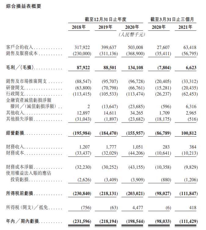招股书显示,在过去的2018年、2019年和2020年三个财政年度,东软熙康的营业收入分别为3.18亿、4.00亿和5.03亿元人民币,录得净亏损分别为2.32亿、2.18亿和1.99亿元人民币,亏损主要是由于公司不断扩大的业务规模导致。
