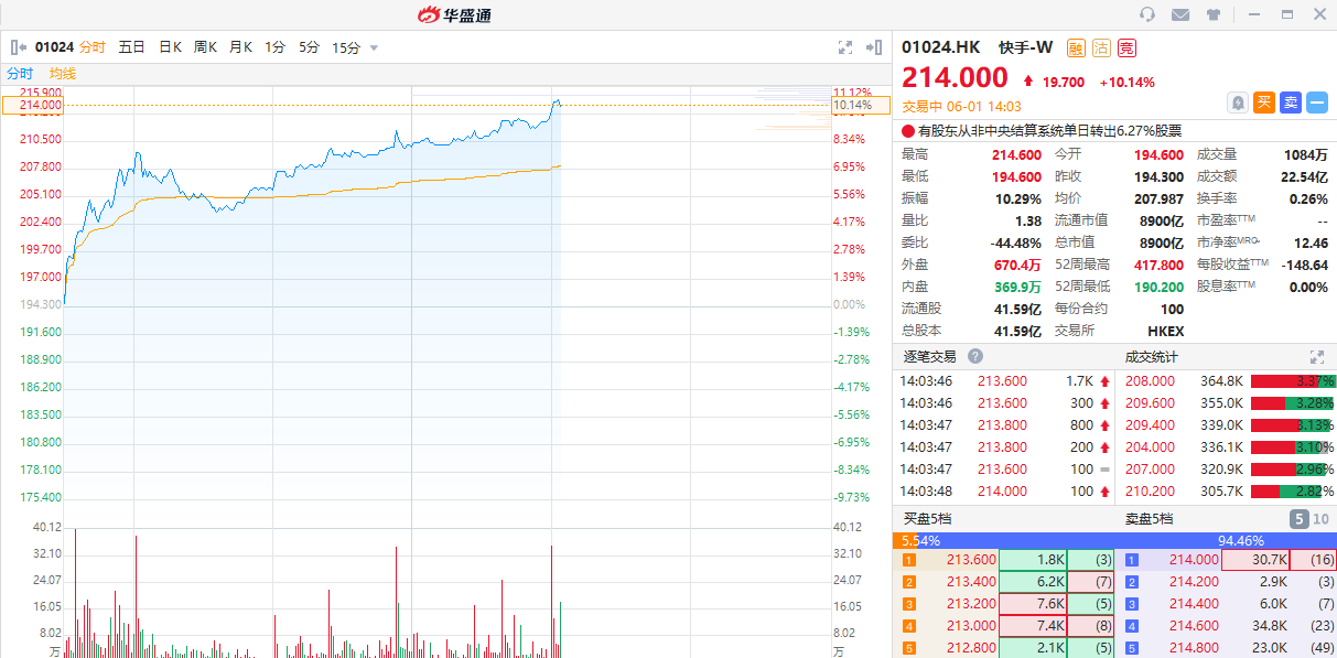 华盛资讯6月1日消息,快手午后再获短线拉升,现涨10.14%,报214港元每股,暂成交22.54亿港元,最新总市值8900亿港元。