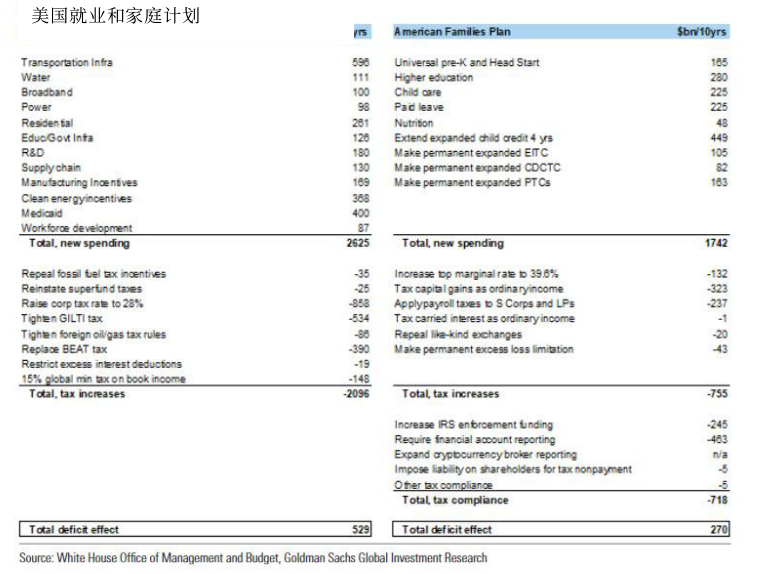 除了规定的赤字,白宫在过去几周发布的预算中已经透露了大部分细节。几周前,白宫已经宣布了两项主要提案,即“美国就业计划”(AJP)和“美国家庭计划”(AFP),除了这两项提案,预算中几乎没有其他政策提案。在大多数情况下,预算中的具体数字与白宫已经公布的相当接近。这些计划摘要见下表。