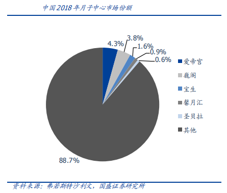 据弗若斯特沙利文行业报告显示,中国月子行业市场呈现高度分散的格局,2018年市占率前5的月子中心占比仅为11.3%,排在第一的爱帝宫市场份额也仅有4%左右。虽然品牌林立,但仍缺乏一个在全国知名且具备领导力的强势品牌,这给了爱帝宫等头部品牌很大的想象空间。