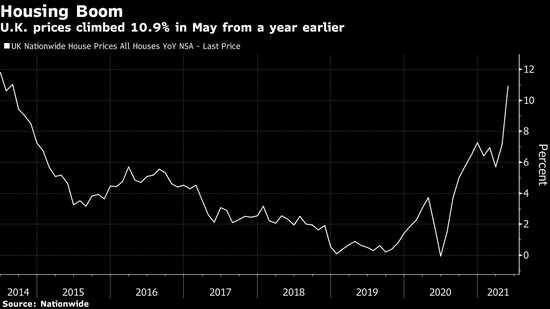 全英房屋抵押贷款协会表示,上个月英国房价较上年同期上涨10.9%,这是七年来的首次两位数增长。该涨幅是经济学家预期的两倍,增强了人们关于财政部暂时取消房地产购置税会给住房市场火上浇油的担忧。