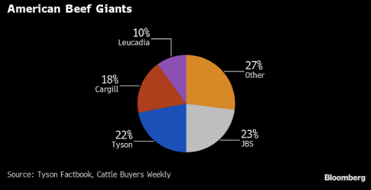 根据泰森食品公司的一份投资者报告,以美国牛肉加工产能的最高值计算,JBS第一,占23%;泰森占22%。JBS约占美国猪肉产能的五分之一。