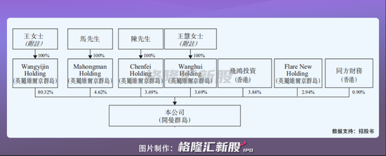 在上市前的股权架构中,王女士、王慧女士、Wangyijin Holding及Wanghui Holding持股达80.32%,为控股股东。剩下股东分别为为马老师持股5%,陈先生持股4%,王慧(王艺瑾之姐妹)持股4%,飞鸿投资持股3.84%、Flare New Holding2.94%及同方财务持股0.94%