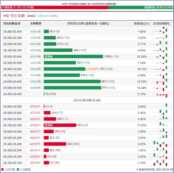 街货分布方面,至周二,恒指牛证街货在收回价28400点至29100点之间,累计相当约1511张期指合约;恒指熊证街货相对集中,在收回价29400点至30100点之间累计相当约4832张期指合约。