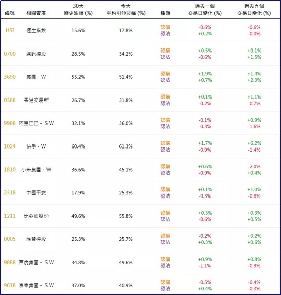 周二恒指相关权证的平均引伸波幅报约17.8%,按日下降0.6个百分点。个股方面,美团、腾讯、快手、小米、百度相关认购证的引伸波幅均按日调升;快手、小米、比亚迪股份及百度的相关认沽证的引伸波幅则按日有所下降。