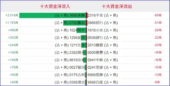 淡仓(认沽证及熊证)方面,周二美团相关淡仓录得约3514万港元资金净流入部署,腾讯、快手也分别见约1193万、496万港元资金净流入;单日净流出资金方面规模较小。