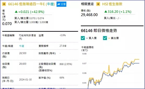 1、强势轮证:恒指瑞通四一牛(66146.HK),周二大涨42.9%;