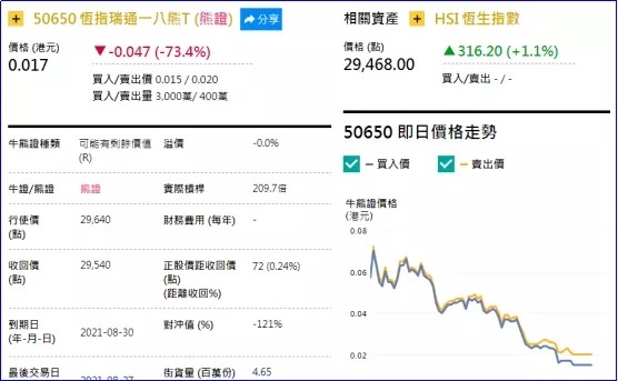 2、看错方向:恒指瑞通一八熊(50650.HK),周二下跌73.4%。