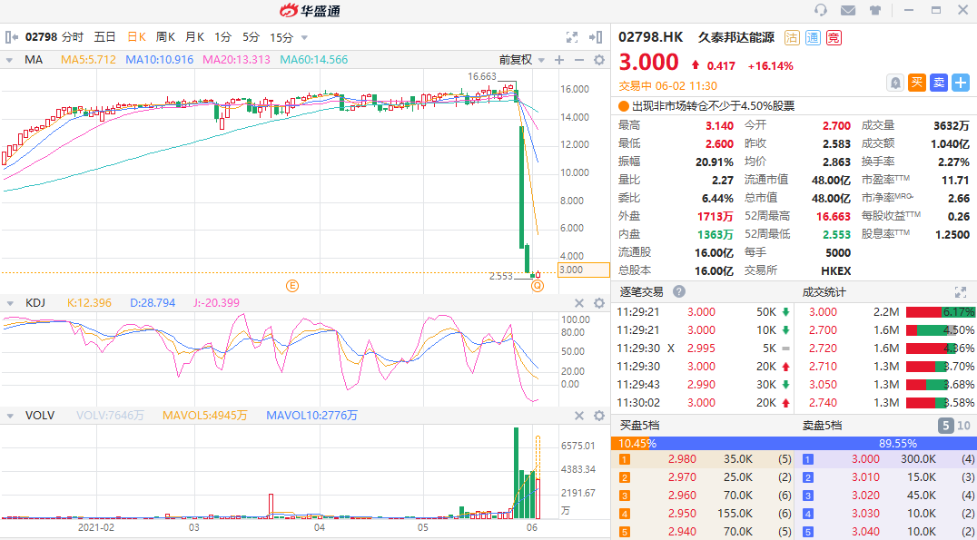 华盛资讯6月2日消息,久泰邦达能源今日强势反弹,盘中持续走高,现涨16.14%,报3港元每股,最新总市值48亿港元。该股曾于5月28日出现闪崩行情,且今日之前的连续三个交易日,累计暴跌逾80%,市值蒸发超200亿。