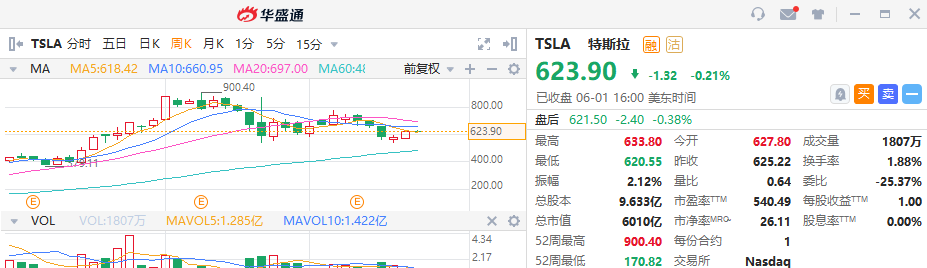 自2021年以来,特斯拉在达到了900.10美元的历史高点之后回调了31.0%。截至6月2日收盘,特斯拉盘后报价621.5美元。