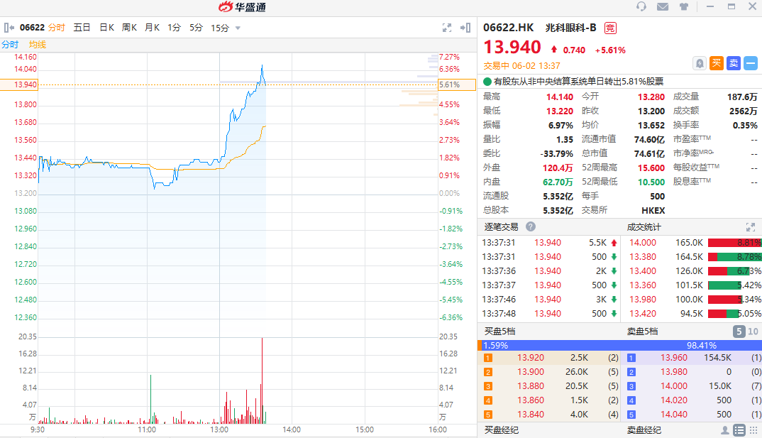 华盛资讯6月2日消息,次新股兆科眼科午后不断上涨,现报13.94港元每股,涨5.61%,最新总市值74.61港元。