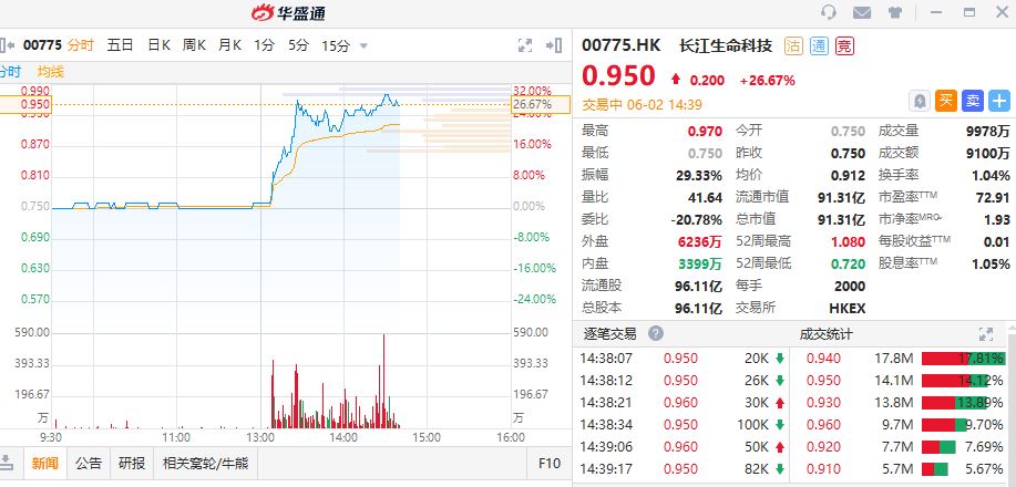 华盛资讯6月2日消息,长江生命科技午后急升。截止发稿,长江生命科技上涨26.67%,现报每股0.95港元,总市值91.31亿港元,成交额9100万港元,换手率1.04%。