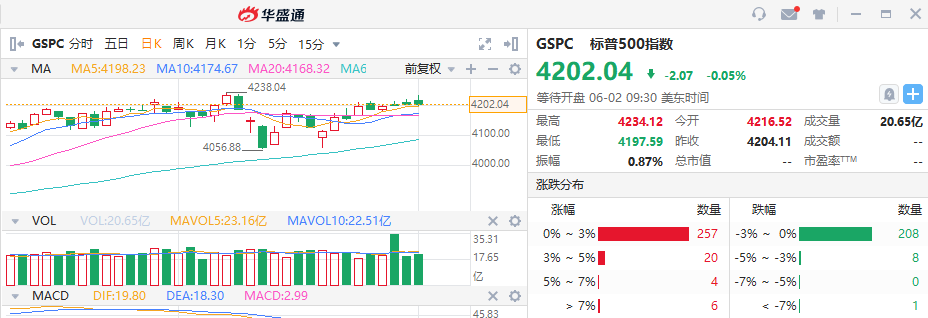 标准普尔500指数5月7日触及4,238.04点的历史高点。