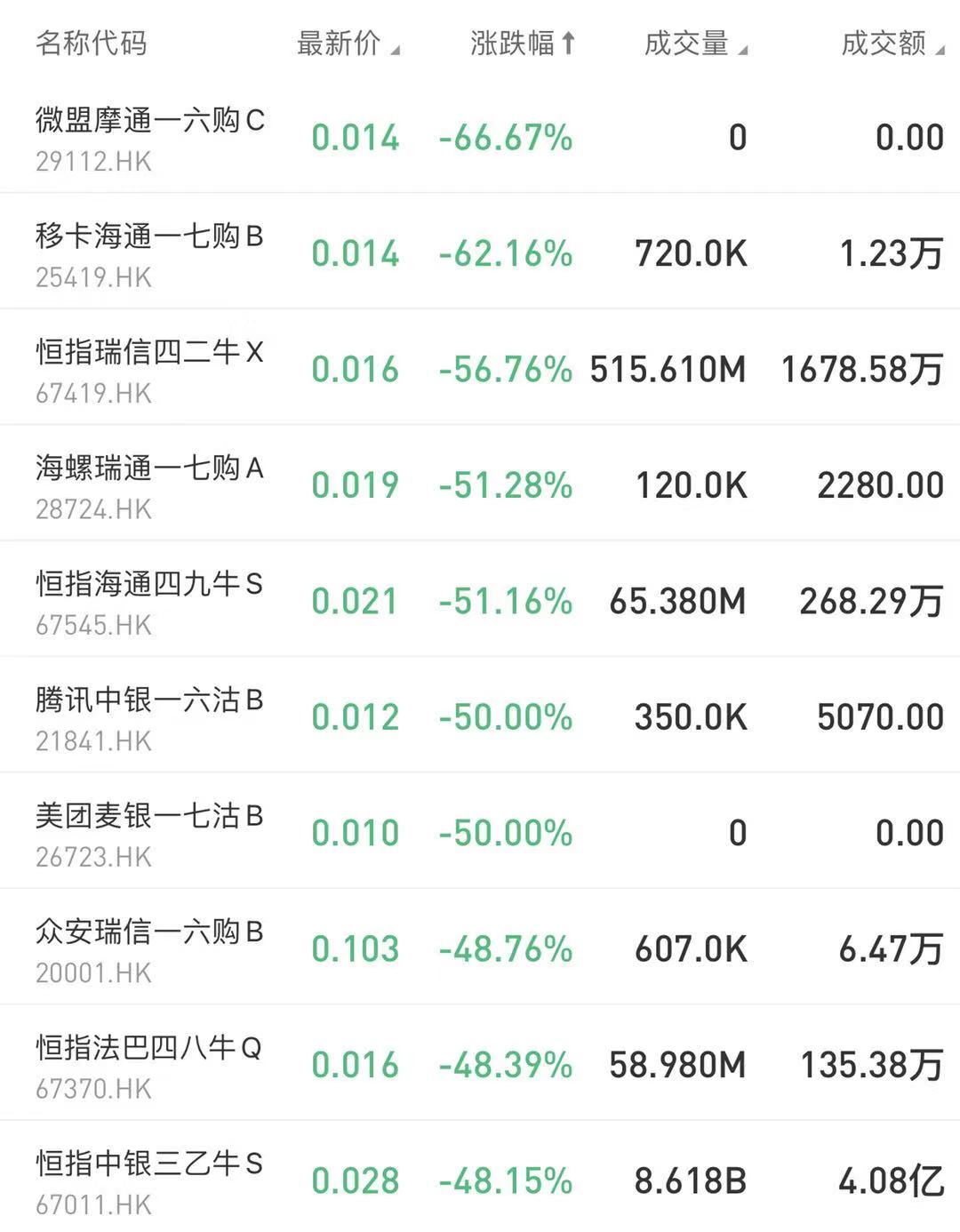 涨幅居前的包括:恒指法巴一七熊N暴涨283.33%;恒指瑞银一八熊N涨270%。