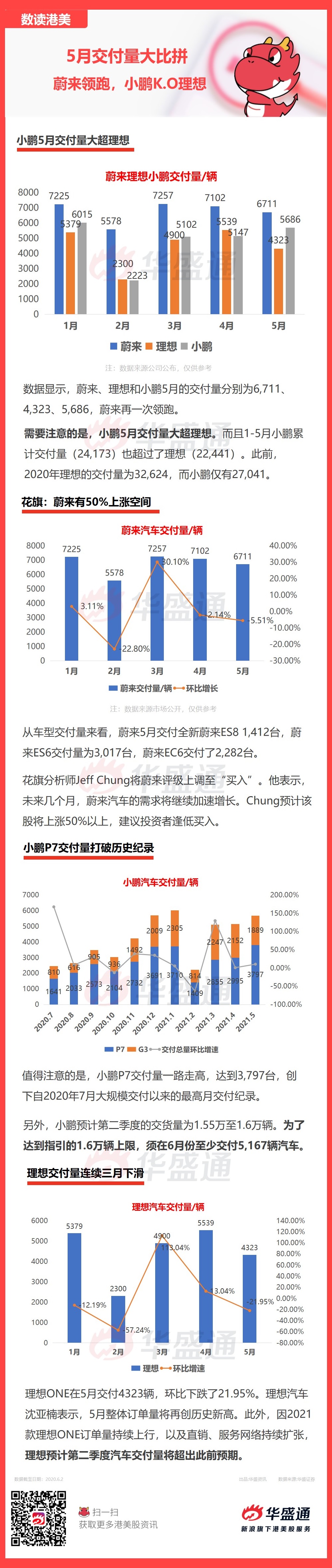 根据最新公布数据显示,蔚来、理想和小鹏5月的交付量分别为6,711、4,323、5,686,蔚来再一次领跑。需要注意是,小鹏5月交付量大超理想。而且1-5月小鹏累计交付量(24,173)也超过了理想(22,441)。此前,2020年理想的交付量为32,624,而小鹏仅有27,041。