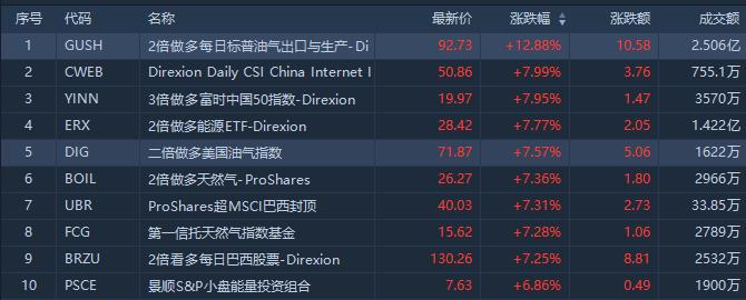 而今日涨幅居前的ETF主要有2倍每日标普油气出口与生产的GUSH涨近13%,成交额2.51亿美元;2倍做多能源ETF涨7.77%,成交额1.42亿美元。