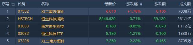 看多恒指相关ETF走弱,南方两倍做多恒科(07226.HK)跌2.22%,成交额8705万港元;南方恒生科技(03033.HK)跌0.85%,成交额1.11亿港元;