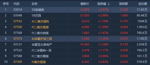 今日涨幅位居前的ETF是TR菲律宾涨近4%;TR巴西涨2.88%。此外,南方两倍做空恒科涨1.78%,南方两倍看空恒指涨1.59%。