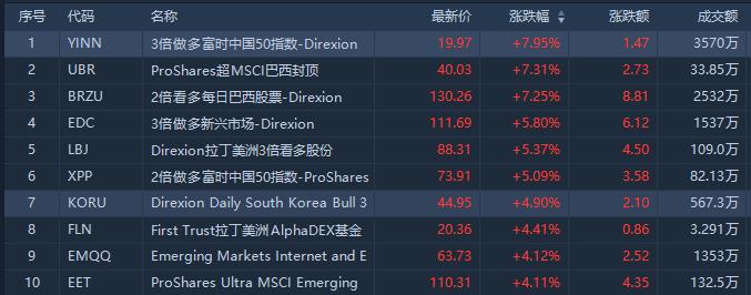 涨幅居前的有3倍做多富时中国50指数的YINN涨近8%,成交额3570万美元;2倍看多巴西股票的BRZU涨7.25%,成交额2532万美元。