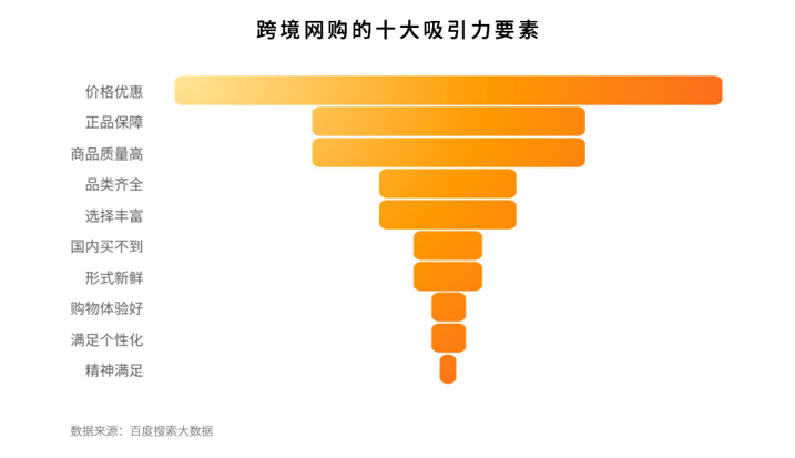 从用户消费的关键因素看,百度搜索大数据显示价格优惠仍是第一大因素。除此之外,正品保障、商品质量高、品类齐全、个性化和精神食粮等因素同样影响着用户的选择。同时,消费者最关心的问题还集中在正品保障、物流、售后服务以及选品等跨境网购过程中的细节问题。