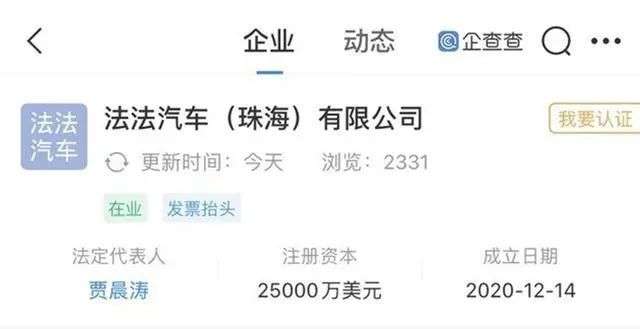 去年12月14日,法拉第未来在珠海注册了一家法法汽车(珠海)有限公司。