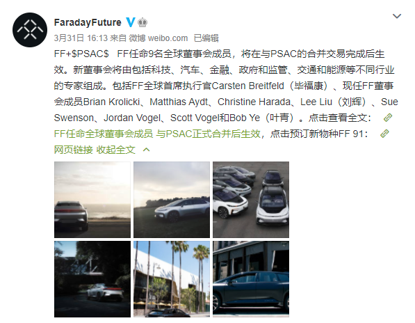 根据法拉第未来3月31日发布的微博显示,法拉第未来的全球董事会中共有九名成员,其中多名有在中国工作的经历。