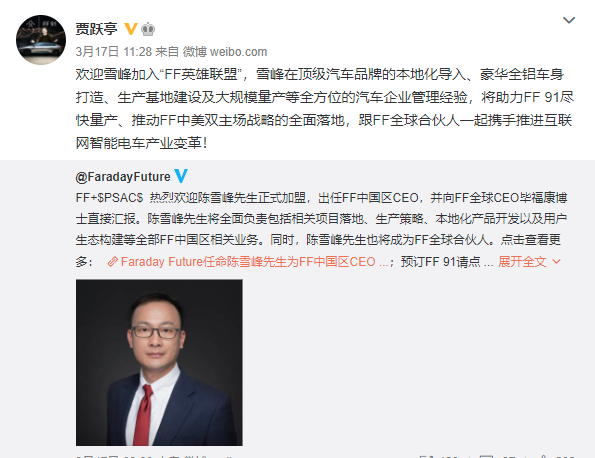 另外,就在法拉第未来微博宣布FF91销售时间的第二天,原奇瑞捷豹路虎汽车高管陈雪峰正式加入法拉第未来。