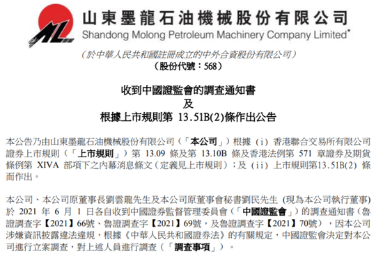 山东墨龙(00568.HK)公布,原董事长刘云龙及原董事会秘书、现任执董刘民昨日﹙1日﹚各自收到中证监的调查通知书,因公司涉嫌讯息披露违法违规,根据内地证券法有关规定,中证监决定对公司进行立案调查,对上述人员进行调查。